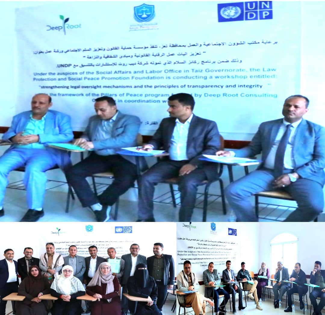 نظمت مؤسسة حماية القانون وتعزيز السلم الاجتماعي، اليوم، بجامعة الحكمة بمدينة تعز ورشة عمل قانونية بعنوان: “تعزيز آليات عمل الرقابة القانونية ومبادئ الشفافية والنزاهة” ضمن أنشطة برنامج ركائز السلام الممول من شركة ديب روت للاستشارات وبرنامج الأمم المتحدة الإنمائي بهدف دعم الإصلاح المؤسسي وترسيخ سيادة القانون وتعزيز الحوكمة الرشيدة وبناء قدرات مؤسسية مستدامة فاعلة محلياً.