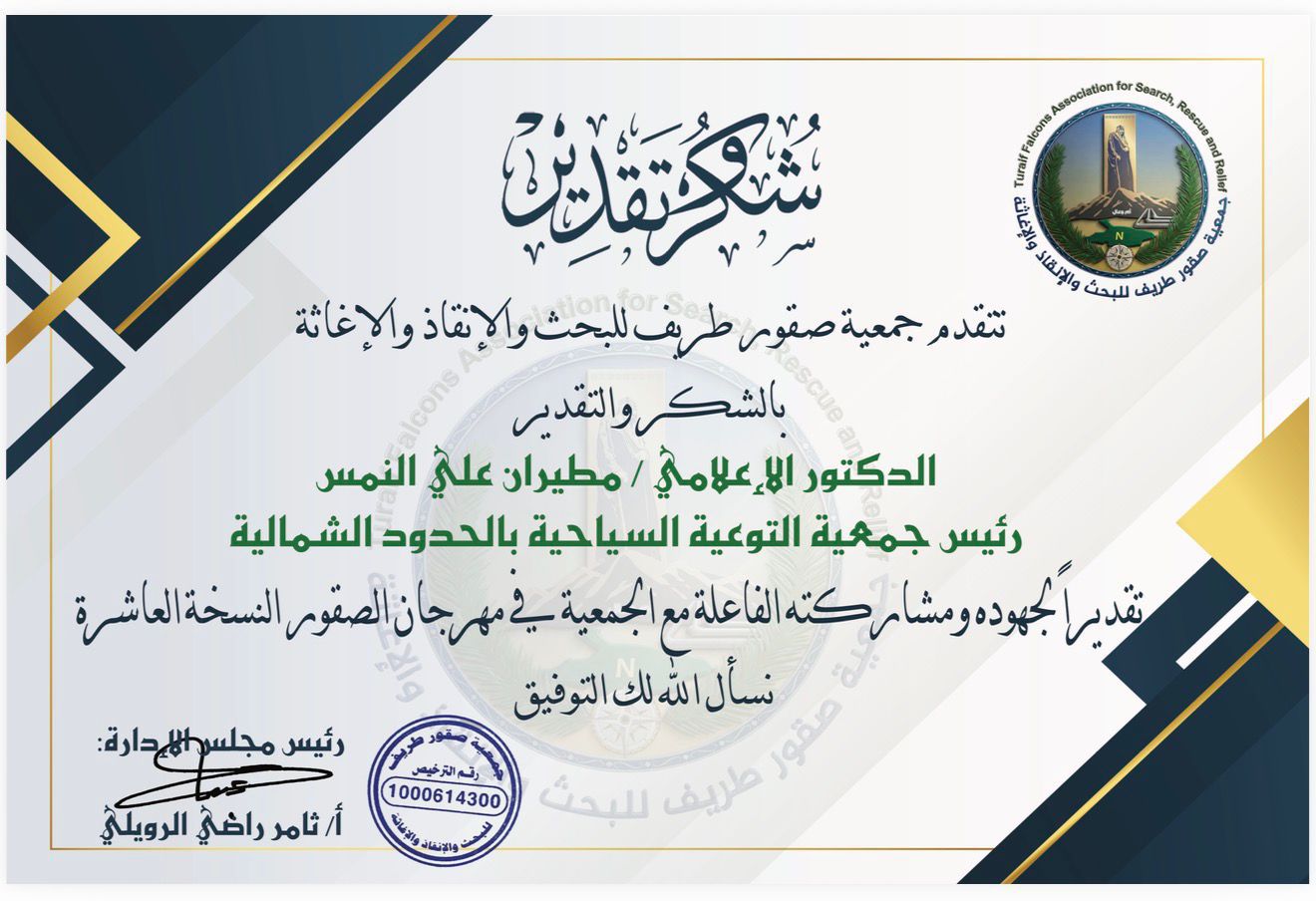 تلقى رئيس جمعية التوعية السياحية بالحدود الشمالية الدكتور مطيران علي النمس شهادة شكر وتقدير من جمعية صقور طريف تقديراً لجهوده ومشاركته الفاعلة مع الجمعية بمهرجان الصقور بنسخته العاشرة .