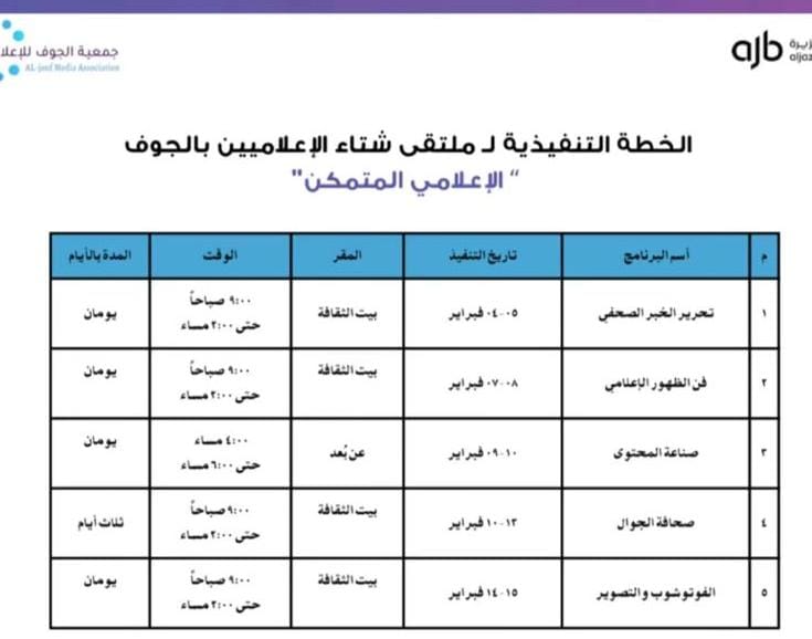 ويُعد ملتقى شتاء الجوف للإعلاميين منصةً مهمة تجمع نخبة من الإعلاميين والمبتدئين، وتسهم في توحيد الجهود الإعلامية لإبراز الفعاليات والمبادرات التي تشهدها المنطقة خلال الموسم الشتوي.