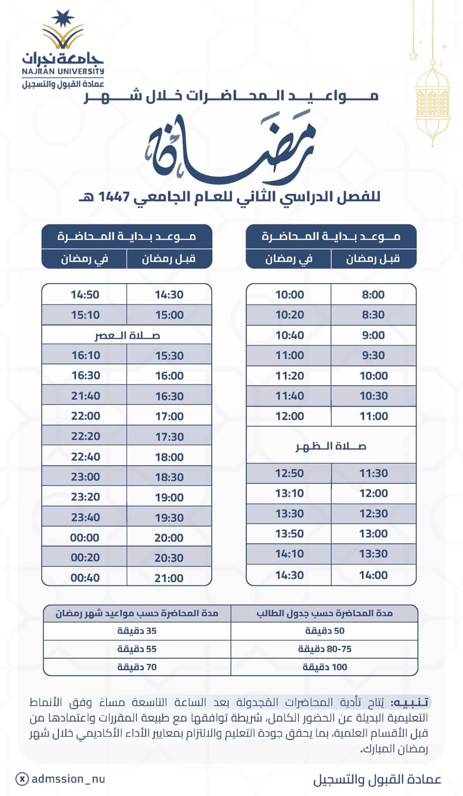 وأكدت جامعة نجران أن هذه الترتيبات تأتي ضمن منظومة تنظيمية متكاملة تهدف إلى توفير بيئة تعليمية محفزة ومتوازنة خلال رمضان، داعيةً الطلبة إلى متابعة جداولهم الدراسية عبر القنوات الرسمية والالتزام بالمواعيد المحددة.
