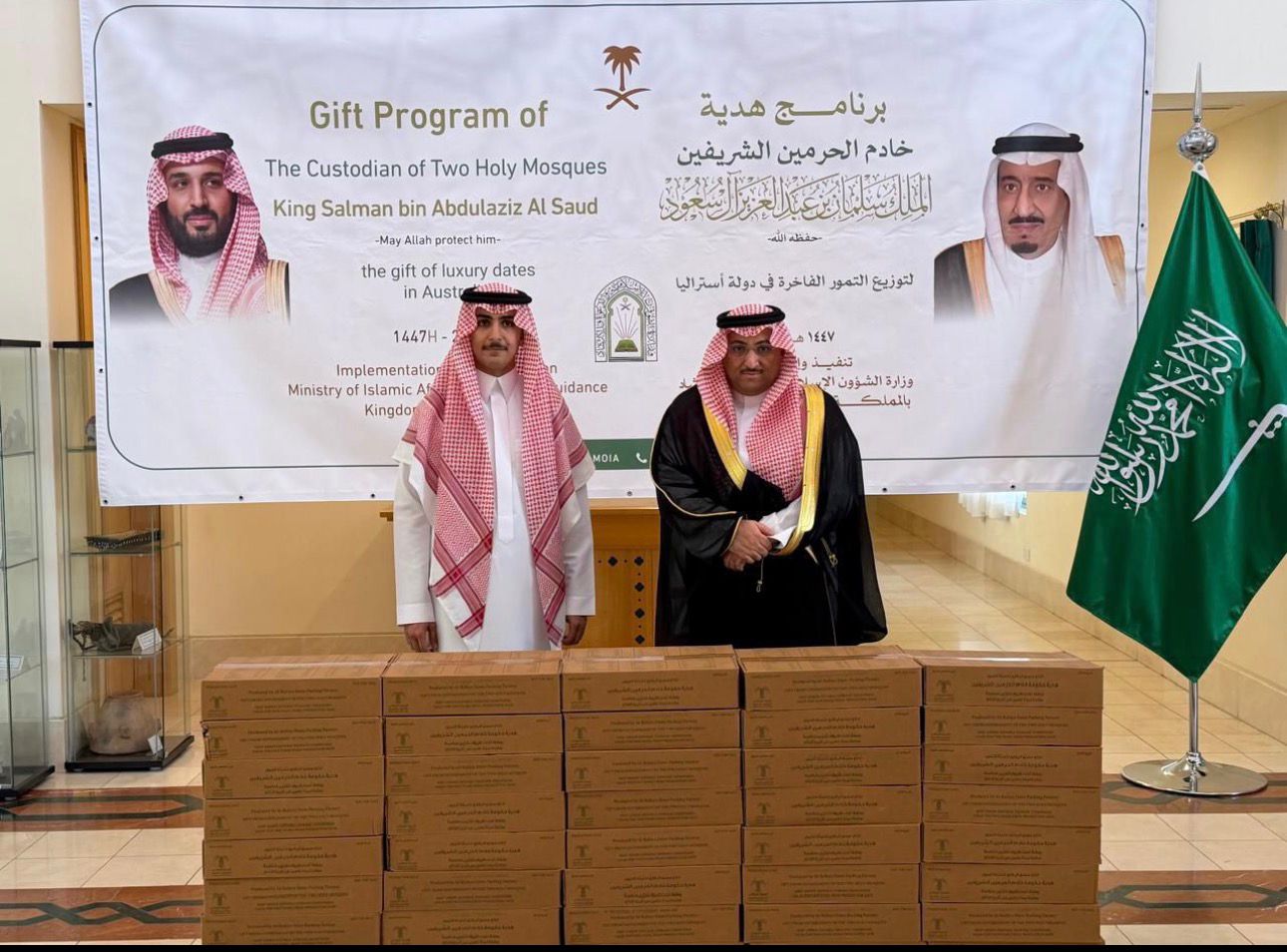 وفي العاصمة الأسترالية كانبرا، دُشّن البرنامج يوم الخميس 2 رمضان 1447هـ، بمقر سفارة خادم الحرمين الشريفين في أستراليا، بحضور سعادة سفير خادم الحرمين الشريفين لدى أستراليا الأستاذ سلطان بن خزيم، ورئيس مجلس الأئمة في أستراليا الشيخ آدم كوندا، وعدد من القيادات والشخصيات الإسلامية، ويبلغ إجمالي ما جرى تخصيصه لأستراليا (3) أطنان من التمور، يستفيد منها (12,000) مستفيد، ضمن برنامج هدية خادم الحرمين الشريفين الذي تنفذه الوزارة سنويًا في عدد من دول العالم.
