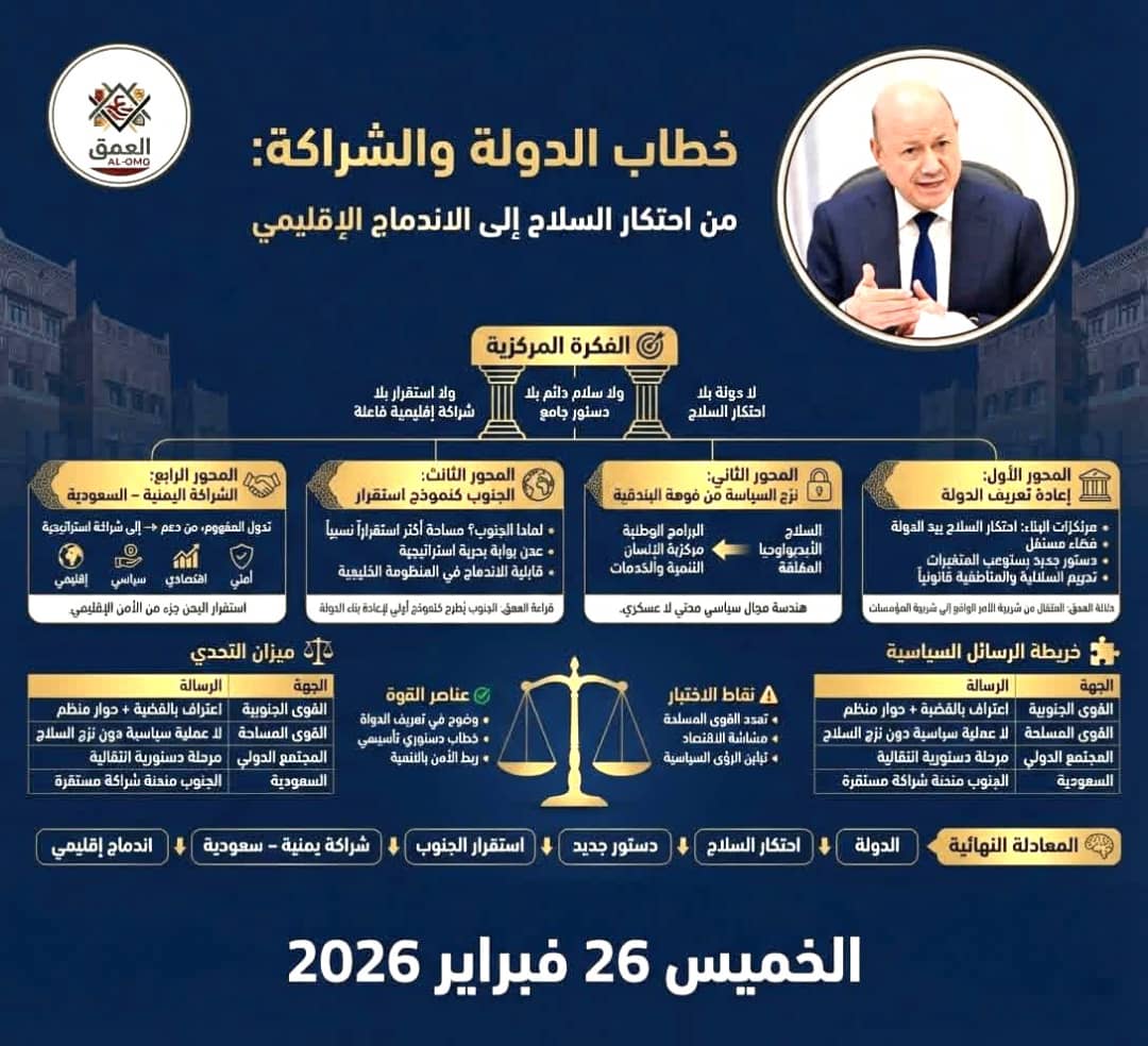 في تحليل حديث نشرته منصة العمق AL-OMQ تناولت المنصة التحولات العميقة في خطاب الدولة اليمنية مؤكدة أن بناء دولة فاعلة يرتبط باحتكار السلاح بيد المؤسسات ووجود دستور جامع يضمن الشراكة الوطنية ويؤسس لسلام مستدام يعالج جذور الصراع ويعزز فرص الاستقرار السياسي والاقتصادي في اليمن خلال المرحلة الانتقالية الراهنة بكل تعقيداتها وتحدياتها الأمنية والسياسية المتراكمة.