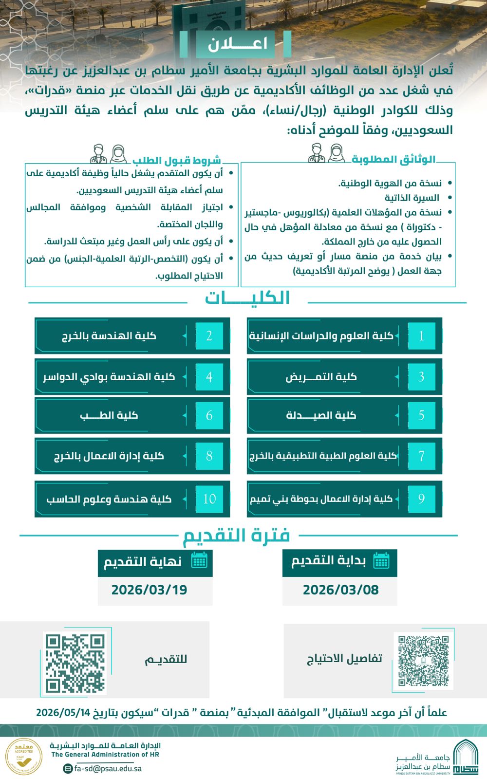 وأكدت جامعة الأمير سطام أن التقديم يتطلب إرفاق عدد من الوثائق، من أبرزها نسخة من الهوية الوطنية، والسيرة الذاتية، ونسخ من المؤهلات العلمية، وبيان خدمة حديث من جهة العمل يوضح المرتبة الأكاديمية، مشيرة إلى أن آخر موعد لاستقبال الموافقة المبدئية عبر منصة «قدرات» سيكون بتار