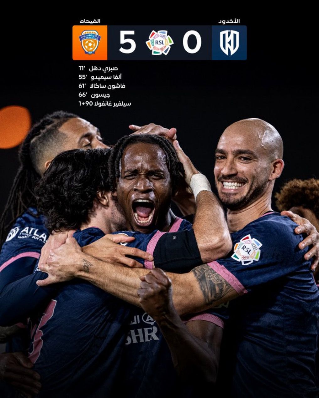 سجل أهداف الفيحاء صبري دهل (11)، وسجل ألفا سيميدو الهدف الثاني (56)، وعاد فاشيون ساكالا لتسجيل الهدف الثالث (63)، وجاء الهدف الرابع عن طريق جايسون (67)، وسجل سيلفر جانفولا الهدف الخامس (90).