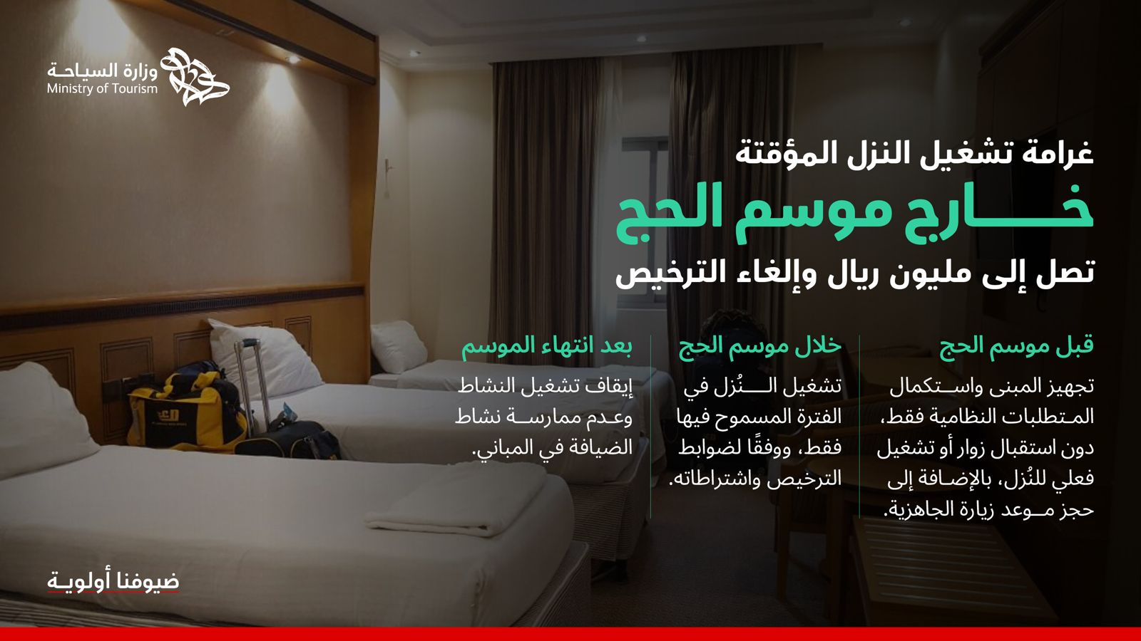 وفي هذا السياق، أعلنت الوزارة أن عقوبة ممارسة نشاط الضيافة السياحية دون ترخيص تصل إلى مليون ريال، وأشارت أيضًا إلى أن قيام حاملي تراخيص النُزل المؤقتة بممارسة النشاط قبل موسم الحج يُعد مخالفًا لاشتراطات الترخيص، وتترتّب عليه غرامات تصل إلى مليون ريال إضافةً إلى إلغاء ترخيص النُزل المؤقتة.