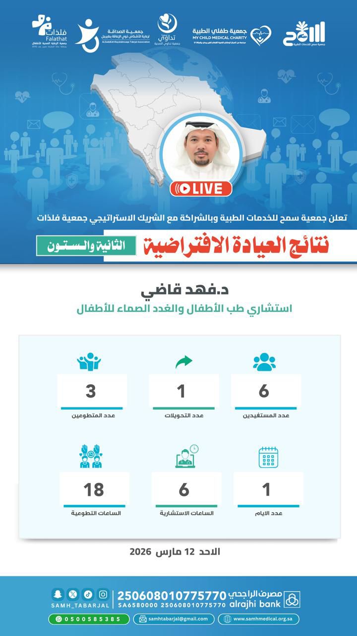وجاءت المبادرة بالتنسيق مع استشاري السكري والغدد الصماء الدكتور فهد قاضي، الذي تولى تقديم الاستشارات الطبية ضمن العيادة الافتراضية، فيما تكفلت جمعية سمح بتنظيم العيادة واستقبال المرضى ومتابعة ملفاتهم الصحية، إضافة إلى تحويل الحالات التي تحتاج إلى متابعة أو تدخل علاجي عبر الفريق الطبي للجمعية.