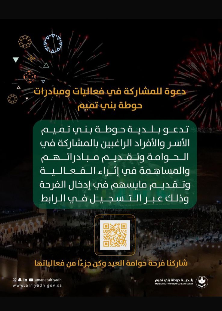 دعت أمانة منطقة الرياض ممثلة في بلدية محافظة حوطة بني تميم المواطنين والمقيمين والإعلاميين وجميع الأسر للمشاركة في حوامة العيد، وذلك في تمام الساعة ٧:٣٠ مساء ليلة العيد بحديقة البرج ؛ والمساهمة في نشر أجواء البهجة بين أفراد المجتمع.
