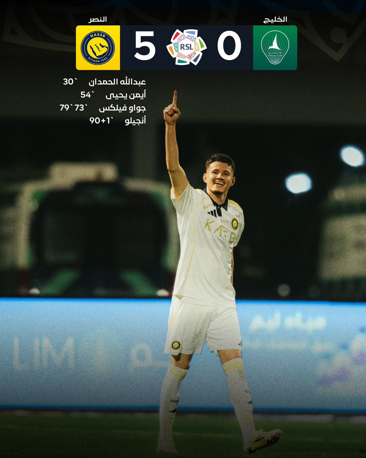 نجح نادي النصر مساء السبت في تحقيق الفوز على حساب الخليج بنتيجة 5-0، في اللقاء الذي جمعهما السبت، على ملعب الأمير محمد بن فهد بالدمام، لحساب منافسات الجولة 26 «جولة يوم العلم» لدوري روشن السعودي .