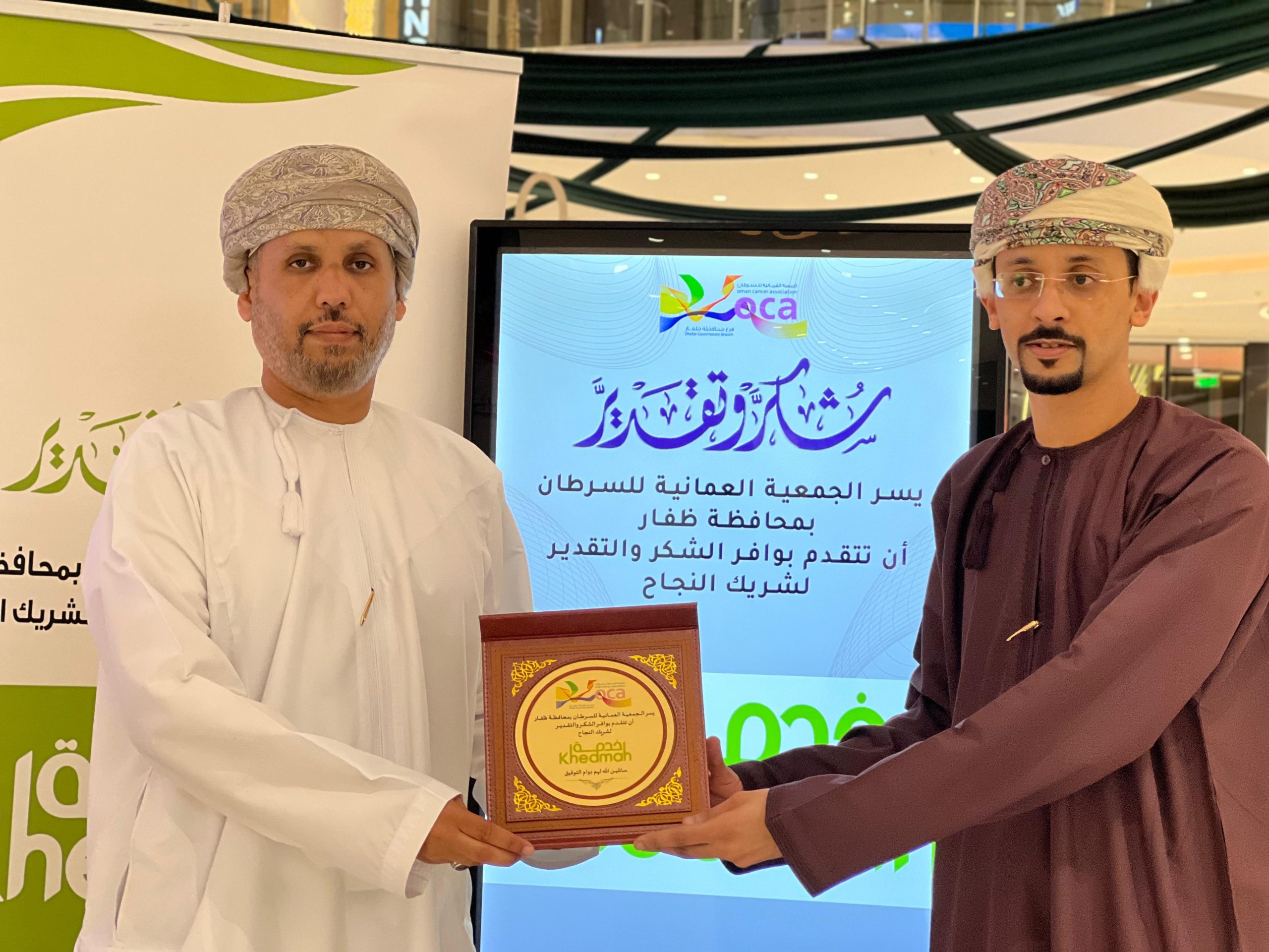 استقبل مجلس إدارة الجمعية العمانية للسرطان فرع محافظة ظفار في ركنها بجراند مول السعادة الفاضل سميح بن رجب عوض سويلم مدير مساعد فروع محافظة ظفار بشركة ظفار الدولية والاستثمار ( خدمة) حيث استقبله زين العابدين بن علي العجيلي نائب رئيس الجمعية وبحضور الشيخ أحمد بن عبدالله المرهون المدير التنفيذي للجمعية ومن مجلس إدارة الجمعية أحمد بن عبدالله سالم المرهون أمين الصندوق وسالم طهموم البدر أمين السر وعبدالله سعيد الشحري عضو مجلس الإدارة وأميرة بنت سالم باعلوي عضو مجلس حيث تفقد ركن الجمعية وتعرف على الخدمات التي يقدمها بعد ذلك تفضل زين العابدين العجيلي نائب الرئيس الجمعية بتقديم درع تذكاري للمدير المساعد ب فروع محافظة ظفار بشركة ظفار الدولية للتنمية والاستثمار (خدمة ) تكريما لشركة على جهودها في دعم برامج الجمعية العمانية للسرطان بمحافظة ظفار ويأتي هذا التكريم تقديرا من الجمعية العمانية للسرطان فرع محافظة ظفار بالجهود التي تبذلها الشركة في دعم مرضى السرطان بمحافظة ظفار على أكمل وجه حيث حرصت شركة عمان للاستثمارات والتمويل (خدمة ) على بناء شراكة مع الجمعية لدعم الانشطة الإنسانية التي تقوم بها الجمعية للسعي في نشرة ثقافة الفحص المبكر والحد من المرض و أوضح سميح رجب عوض سويلم مساعد مدير فروع محافظة ظفار – شركة ظفار الدولية للتنمية والاستثمار (خدمة) عن دور الشركة في دعم الجانب الإنساني، حيث الشركة تقوم بدعم جانب المسؤولية الاجتماعية وبلا شك دعم الجمعية العمانية للسرطان بمحافظة ظفار مهم جدًا في تخفيف معاناة مرضى السرطان