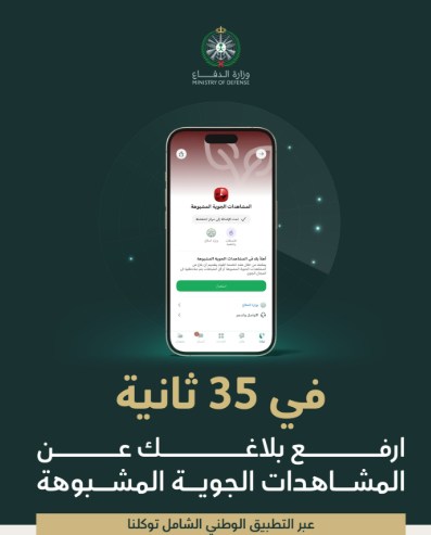 أطلقت وزارة الدفاع خدمة الإبلاغ عن المشاهدات الجوية المشبوهة عبر التطبيق الوطني الشامل “توكلنا”، لتتيح للمواطنين والمقيمين في المملكة فرصة الإبلاغ عن أي مشاهدات جوية مشبوهة (الطائرات المسيَّرة أو الصواريخ)، وذلك لضمان وصول هذه البلاغات في وقت قياسي، بما يحقق سرعة الاستجابة لحماية الوطن وصون مقدراته.