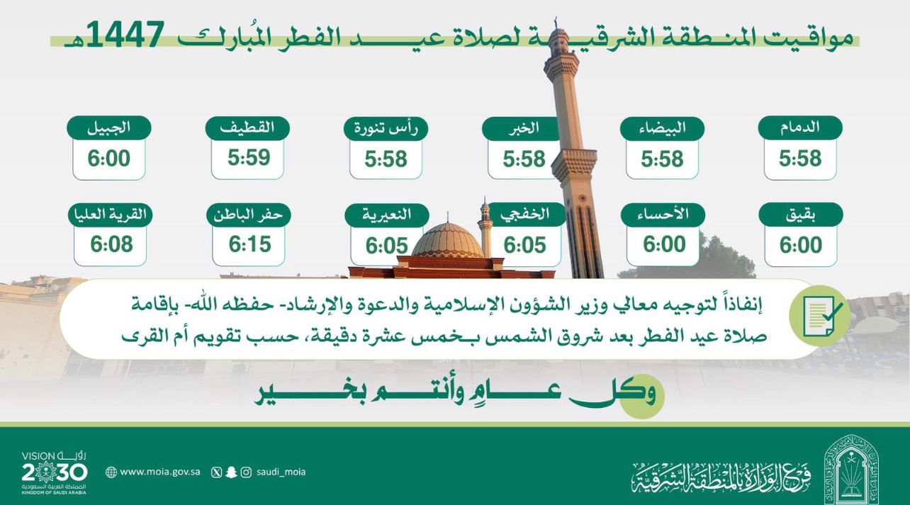أكملت وزارة الشؤون الإسلامية والدعوة والإرشاد، ممثّلةً بفرعها في المنطقة الشرقية، جميع الاستعدادات لإقامة صلاة عيد الفطر المبارك لعام 1447هـ، حيث جرى تهيئة (1124) جامعاً ومسجداً ومصلى في مدن ومحافظات المنطقة، وذلك ضمن خطة الفرع لاستقبال المصلين في أجواء مهيأة. وشملت أعمال التهيئة تنفيذ برامج مكثفة في النظافة والصيانة والتشغيل، والعناية بالمصليات والجوامع وساحاتها، وتهيئة مرافقها وتجهيزها على الوجه المطلوب بما يضمن راحة المصلين.