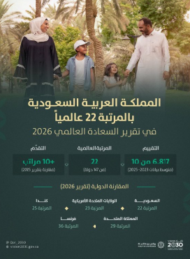 تقدمت المملكة العربية السعودية إلى المرتبة الـ22 عالميًا في تقرير السعادة العالمي لعام 2026م، الصادر عن مركز أبحاث الرفاهية في جامعة أكسفورد بالتعاون مع مؤسسة غالوب الدولية، من بين 147 دولة، لتحقق قفزة قدرها 10 مراتب عن ترتيبها في تقرير العام الماضي، وبدرجة تقييم بلغت 6.817 من 10 على مقياس تقييم الحياة.