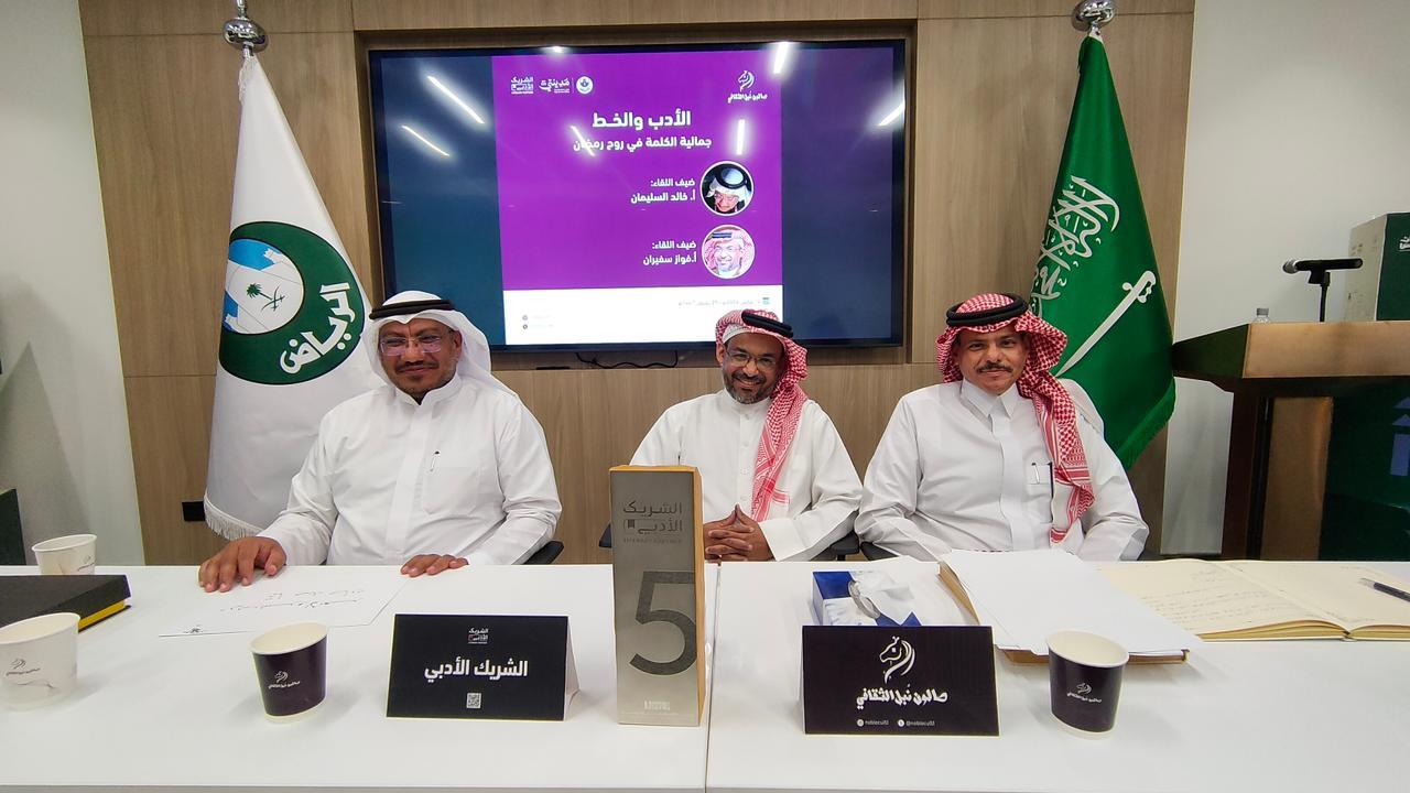 وشارك في اللقاء كلٌّ من الأستاذ خالد السليمان والأستاذ فواز بن سفيران، فيما أدار الحوار الأستاذ أحمد الحربي، حيث تناولت الجلسة العلاقة الجمالية بين الأدب وفن الخط العربي، بوصفهما مجالين يلتقيان في خدمة الكلمة العربية وإبراز جمالياتها.