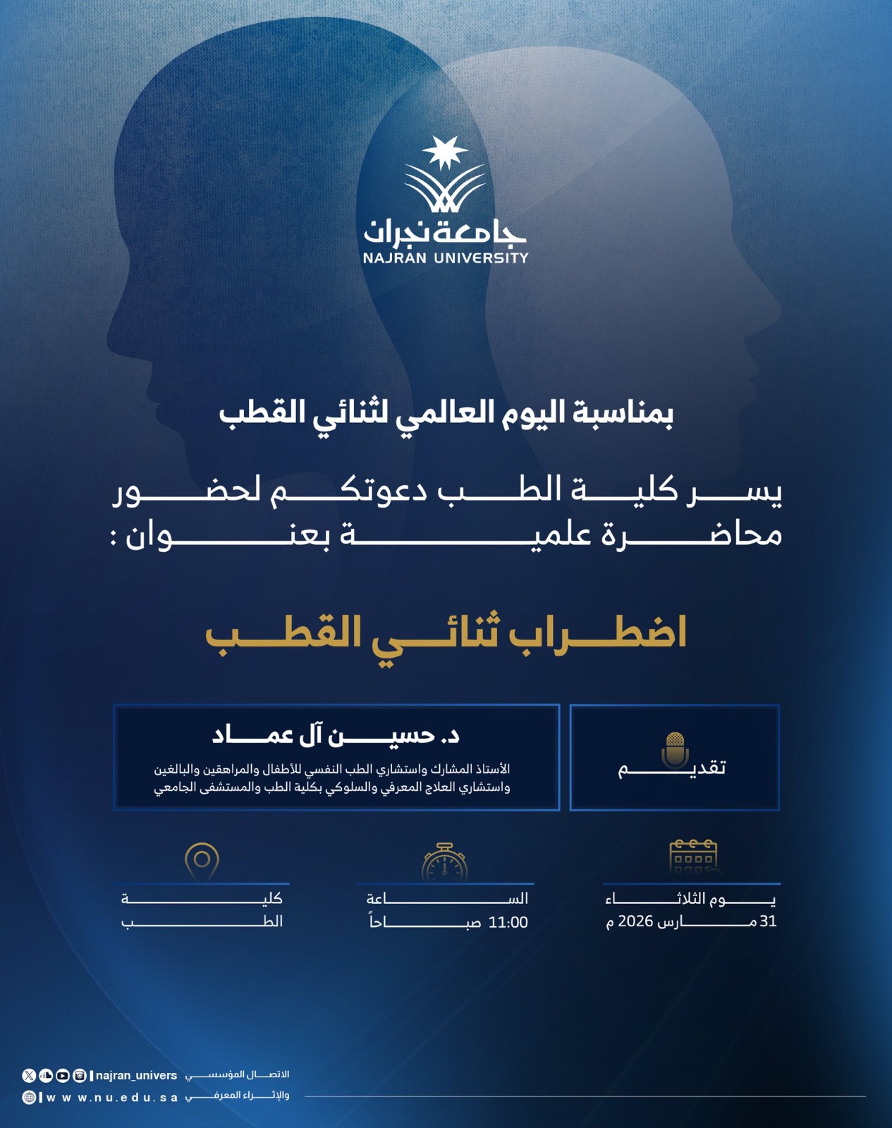 تنظم كلية الطب بجامعة نجران ، بمناسبة اليوم العالمي لاضطراب ثنائي القطب، محاضرة علمية بعنوان «اضطراب ثنائي القطب»، يقدمها الدكتور حسين آل عماد، وذلك يوم الثلاثاء الموافق 31 مارس، ضمن جهود الكلية الرامية إلى تعزيز الوعي بالصحة النفسية، ونشر المعرفة الطبية المتخصصة حول الاضطرابات النفسية وأهمية التشخيص المبكر لها.