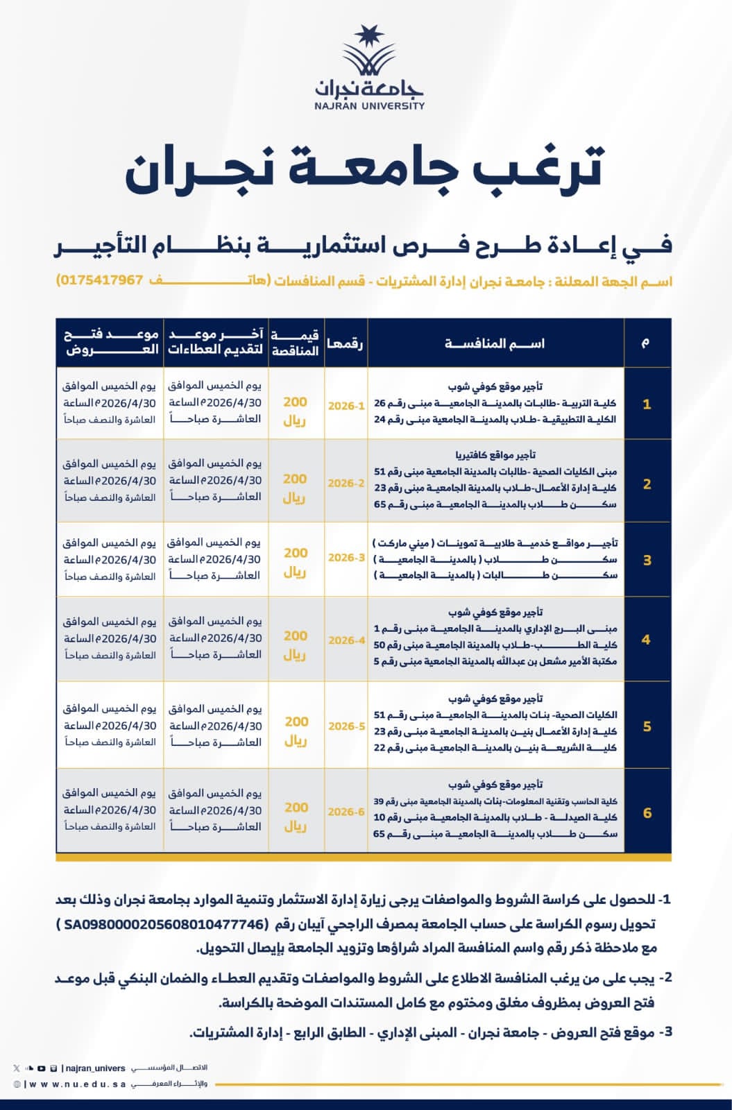 ودعت الجامعة المستثمرين والجهات ذات العلاقة إلى الاطلاع على تفاصيل المنافسات والشروط عبر القنوات الرسمية، والتقدم وفق الإجراءات المعتمدة، مؤكدةً التزامها بتقديم التسهيلات اللازمة لدعم المستثمرين وتمكينهم من الاستفادة من هذه الفرص النوعية.