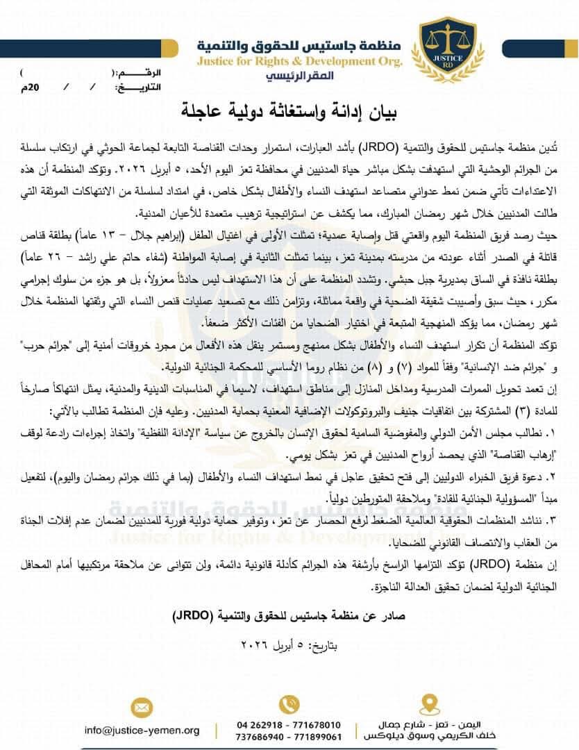 داعياً المجتمع الدولي، وفي مقدمته مجلس الأمن والمفوضية السامية لحقوق الإنسان، إلى اتخاذ إجراءات عاجلة وفعالة، تشمل فتح تحقيق دولي مستقل ومحاسبة المتورطين، إضافة إلى توفير حماية فورية للمدنيين في تعز، والعمل على رفع الحصار، بما يضمن وقف هذه الجرائم وتحقيق العدالة للضحايا.