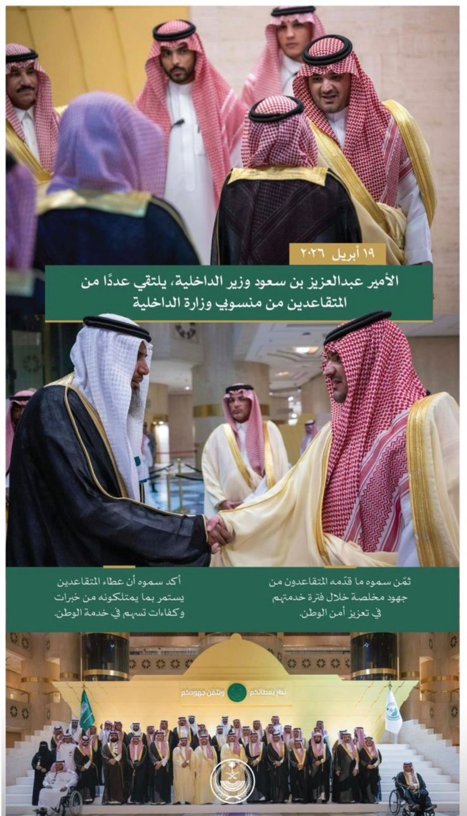 وأكد سموه أن عطاء المتقاعدين لا يتوقف بانتهاء الخدمة، بل يستمر بما يمتلكونه من خبرات وكفاءات مهنية اكتسبوها على مدى سنوات عملهم، بما يسهم في خدمة الدين ثم الملك والوطن.