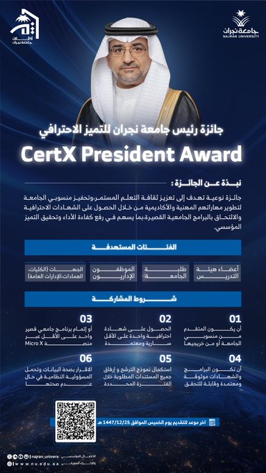 أعلنت جامعة نجران إطلاق جائزة رئيس الجامعة للتميز الاحترافي، وذلك في إطار جهودها الرامية إلى تعزيز ثقافة التعلم المستمر، وتحفيز منسوبيها على تنمية قدراتهم المهنية والأكاديمية من خلال الشهادات الاحترافية والبرامج القصيرة، بما يسهم في رفع كفاءة الأداء وتحقيق التميز المؤسسي.
