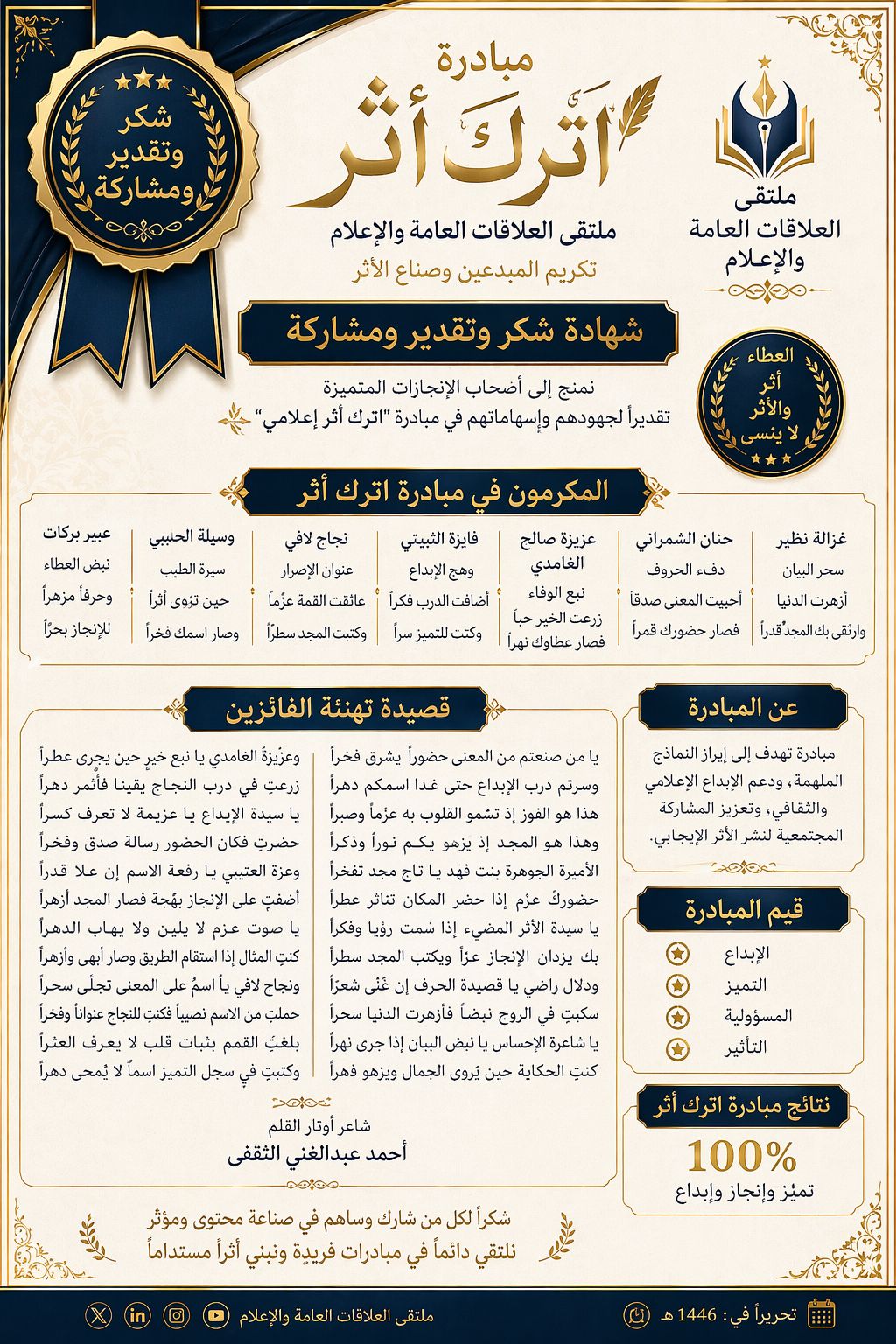 وقد أكدت إدارة ملتقى العلاقات العامة والإعلام أن مبادرة “اترك أثر” تمثل منصة نوعية لاكتشاف وتمكين الكفاءات، وتسليط الضوء على التجارب الملهمة التي تستحق أن تُروى وتُحتفى بها، مشيرة إلى أن نسبة التميز التي حققها الفائزون، والتي بلغت 100%، لم تكن مجرد رقم، بل تعبيرًا حقيقيًا عن جودة المحتوى وقوة التأثير.