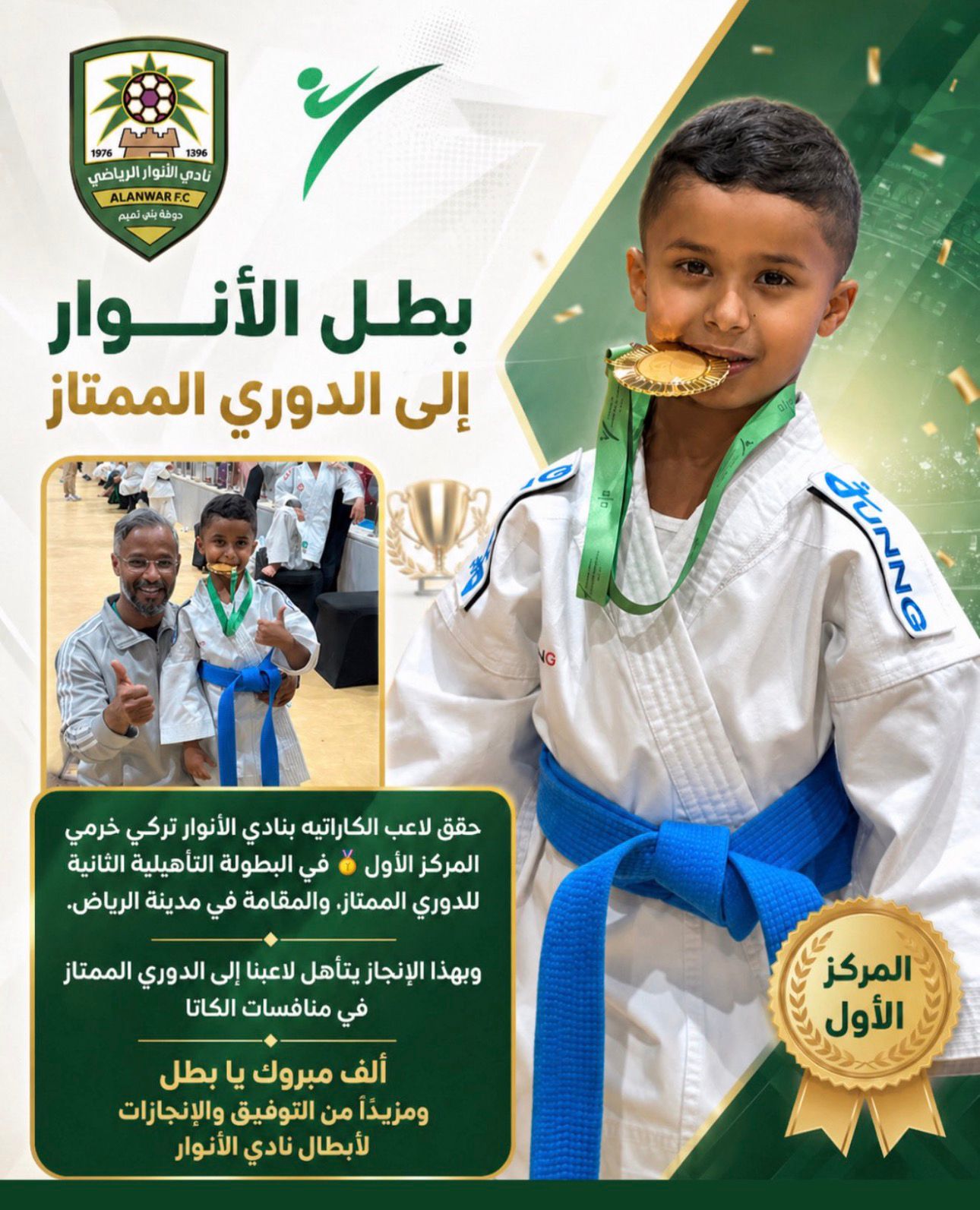 حقق لاعب الكاراتيه بنادي الأنوار تركي خرمي المركز الأول في البطولة التأهيلية الثانية للدوري الممتاز، ضمن منافسات الكاتا، ليتأهل بذلك إلى الدوري الممتاز مبروك يابطل تحت إشراف المدرب / فهد الموينع
