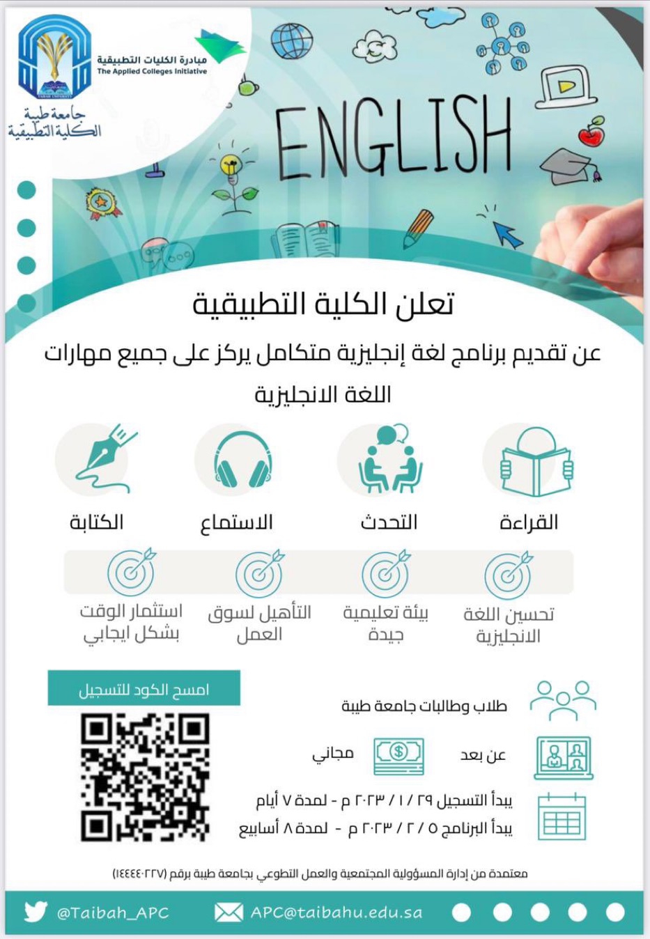 أطلقت جامعة طيبة ممثلة في الكلية التطبيقية برنامج لغة إنجليزية مساء السبت لتحسين مستوى اللغة الإنجليزية لطلبة الجامعة ويأتي ضمن المبادرات المجتمعية المعتمدة .