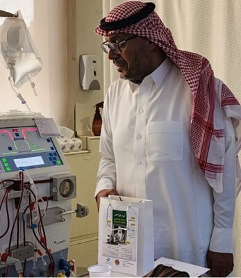 بهدف مشاركة المرضى وهم على أجهزة الغسيل أفراح هذا الوطن الغالي وتهنئتهم بهذا اليوم المجيد وتقديم الهدايا لهم والدعاء لهم بالشفاء وهم ” حسن بن حنين العبسي قائد الفريق ، طلال هادي ساكت نائب القائد، منصور عثمان بن حسن منسق ، يحيى بن حنين العبسي مشرف تقني ، فواز بن سليمان سعود الحربي عضو، رياض عويد بغداد العنزي عضو، علي بن حنين العبسي عضو، حسين عبدالله سعيد الشهراني – طالب ، م/عادل عثمان السيد الداعم، م/ عادل عثمان السيد الداعم، صالح بن عبدالله المرشد عضو أساسي ، عبدالله بن فهد العبدالواحد منسق متعاون”.