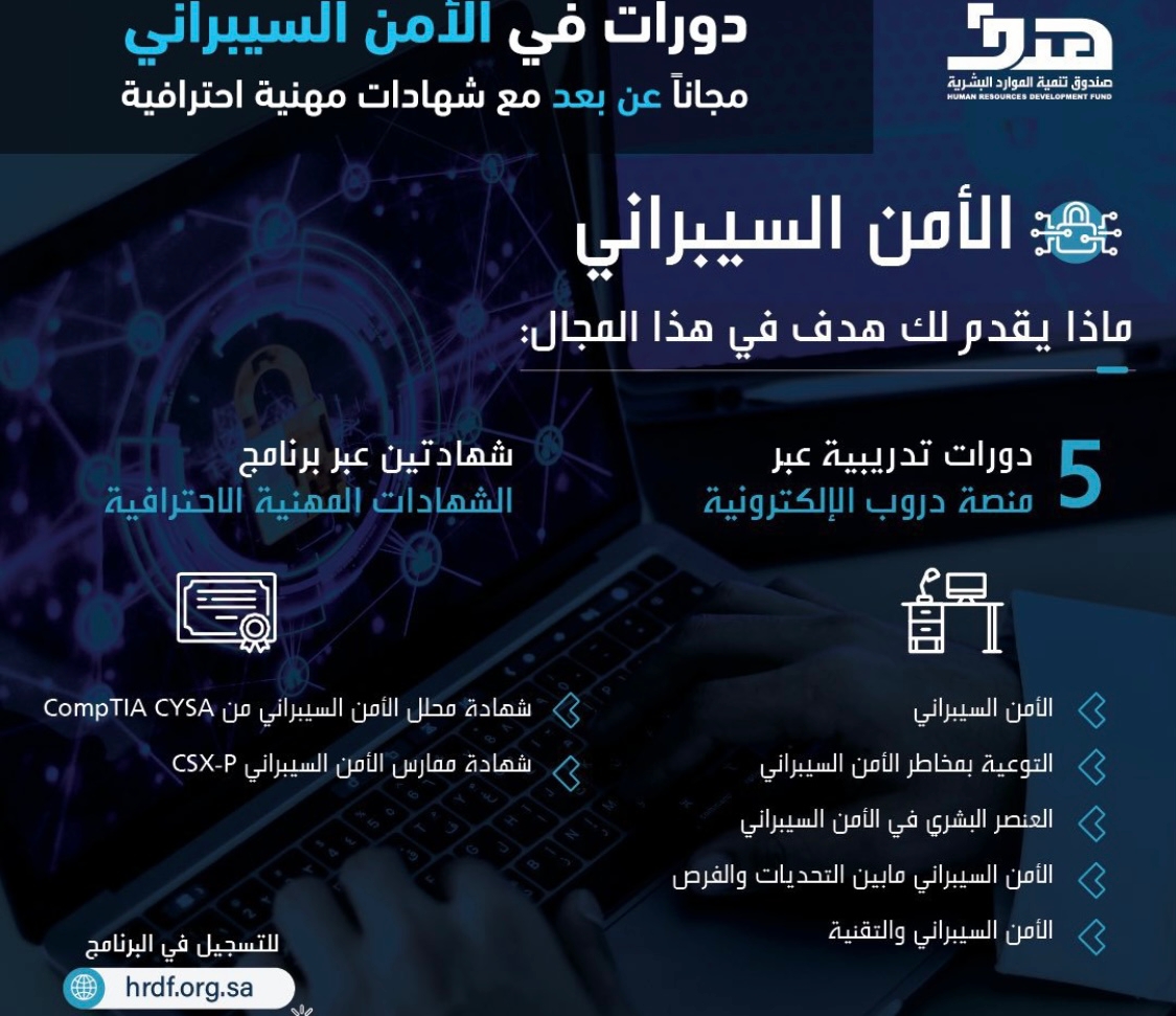 أعلن صندوق تنمية الموارد البشرية (هدف) عن طرح (7) دورات تدريبية مجانية عن بعد الأمن السيبراني، منها (5) دورات مع شهادة حضور معتمدة و (دورتين) عبر برنامج الشهادات المهنية الاحترافية، وهي من أهم الدورات المجانية المتاحة مجاناً في مجال الأمن السيبراني.