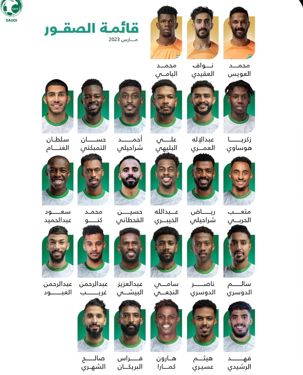 أعلنت إدارة المنتخب الوطني الأول قائمة المدير الفني إيرڤي رينارد للمشاركة في المعسكر الإعدادي الذي سيقام في محافظة جدة خلال الفترة ( 20 – 28 ) من شهر مارس الجاري، ويأتي المعسكر متزامنًا مع أيام الفيفا في شهر مارس 2023 .