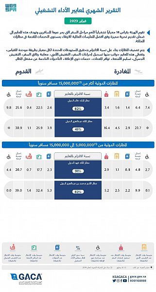 الهيئة العامة للطيران المدني أصدرت اليوم، التقرير الشهري عن أداء مطارات المملكة الدولية والداخلية، لشهر فبراير 2023م، وفقاً لأربعة عشر معياراً أساسياً لقياس الأداء، وذلك تطبيقاً للتوجُّهات الاستراتيجية التي تستهدف تجويد الخدمات المُقدَّمة للمسافرين، ورفع مستواها، وتحسين تجربة المسافر في مطارات المملكة.
