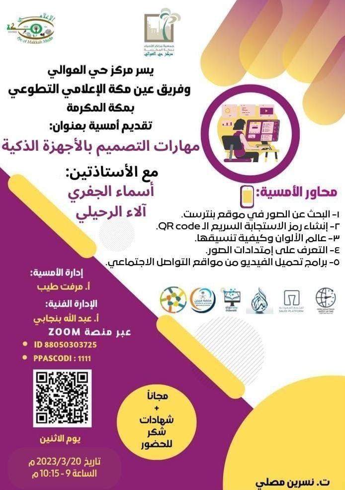 يُقدم مركز حي العوالي وفريق عين مكة الإعلامي التابعين لجمعية مراكز الأحياء بمكة المكرمة أمسية أساسيات التصميم بالأجهزة الذكية، مع الأستاذتين :أسماء الجفري ، و آلاء الرحيلي ، وذلك يوم الاثنين 20/3/2023 ، الساعة 9 – 10:15م، عبر رابط الزووم.