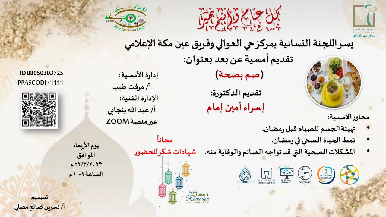 بمناسبة قدوم شهر رمضان المبارك تقدم اللجنة النسائية لمركز حي العوالي وفريق عين مكة الإعلامي التابعين لجمعية مراكز الأحياء بمكة المكرمة أمسية عن بعد بعنوان “صم بصحة” ، مع الدكتورة إسراء أمين إمام، أخصائية طب أسرة، وذلك يوم الأربعاء 22/3/2023 الساعة 9 – 10م، عبر رابط الزووم /