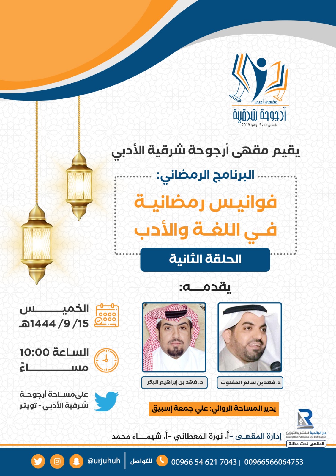يقيم مقهى أرجوحة شرقية الأدبي الحلقة الثانية من البرنامج الرمضاني (فوانيس رمضانية في اللغة والأدب) ، التي يقدمها الدكتور فهد بن سالم المغلوث ، والدكتور فهد بن إبراهيم البكر ، وذلك يوم الخميس المقبل 15 / 9/ 1444هـ الساعة 10:00 مساء على مساحة أرجوحة شرقية الأدبي على موقع التواصل الاجتماعي “تويتر”.