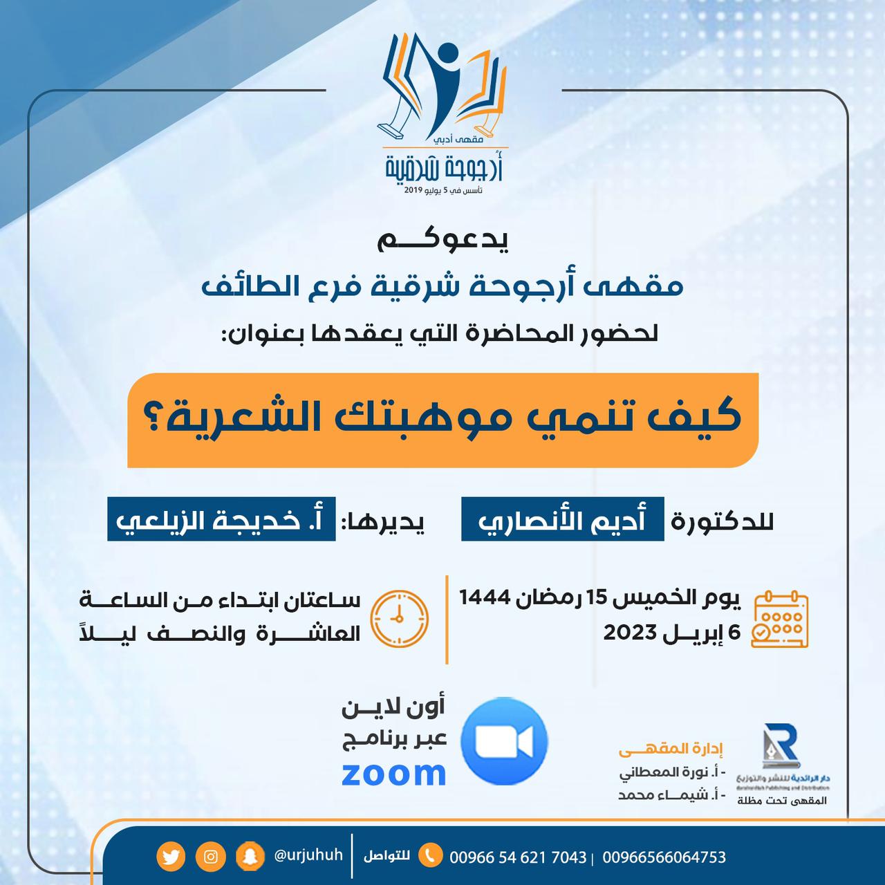ينظم مقهى أرجوحة شرقية / فرع الطائف، محاضرة ثقافية بعنوان (كيف تنمي موهبتك الشعرية؟)، للدكتورة / أديم الأنصاري، وذلك يوم الخميس 15 رمضان 1444، الموافق 6 إبريل 2023، عبر تطبيق زووم ، ابتداء من الساعة العاشرة والنصف ليلا، ولمدة ساعتين.