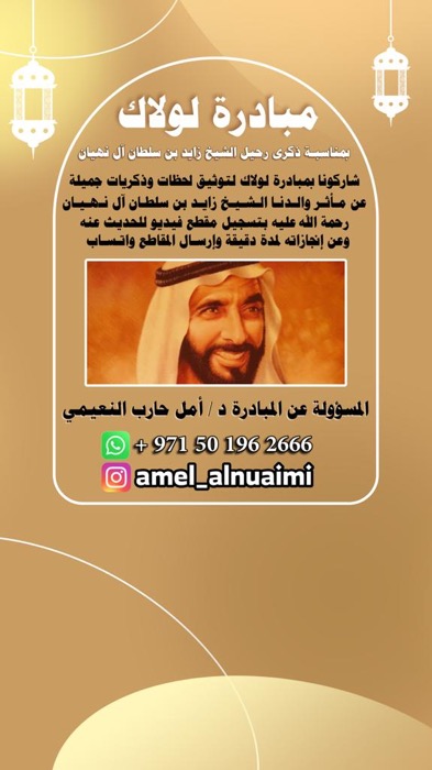 بمناسبة ذكرى رحيل الشيخ زايد بن سلطان آل نهيان اقامت سيدة الأعمال الإماراتية والكاتبة د/ أمل النعيمي (مبادرة لولاك ) واطلقت هذه المبادرة باليوم الثالث عشر من شهر رمضان المبارك وحثت الجميع على المشاركة من دولة الإمارات وجميع دول الخليج والمملكة العربية السعودية والكويت والعالم العربي ودعت إلى تعاون الجميع بروح خليجية وعربية لذكر إنجازات الشيخ زايد بن سلطان آل نهيان رحمة الله عليه وتتم المشاركة بتسجيل مقطع فيديو للحديث عنه وعن إنجازاته لمدة دقيقة أو اقل ويتم عرضها عبر حسابها على الإنستقـرام