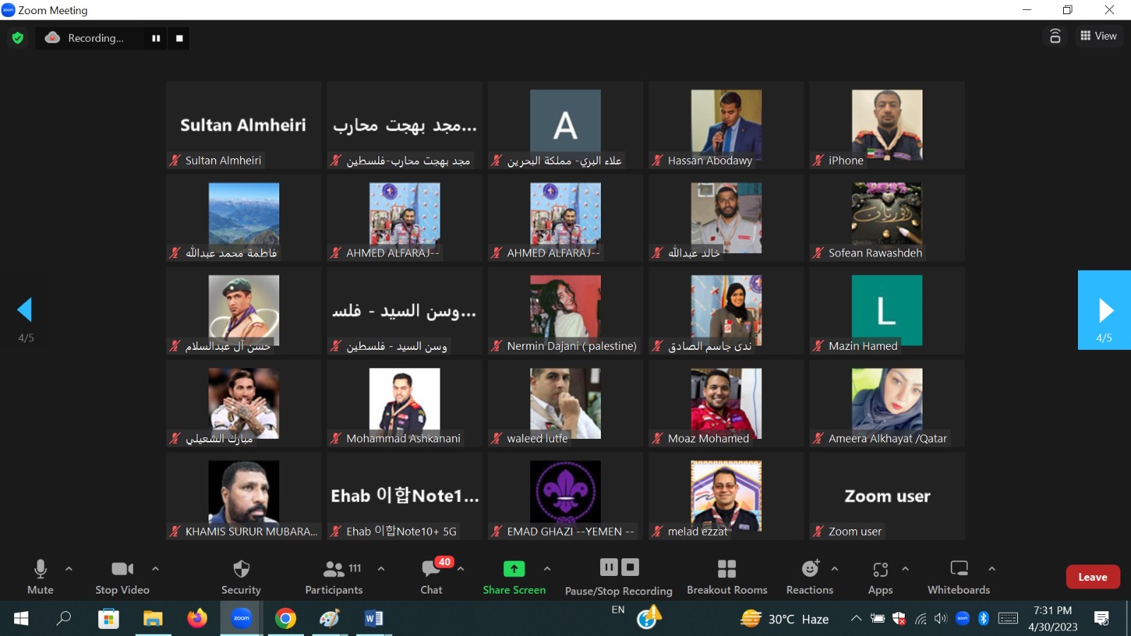عقد الإقليم الكشفي العربي، أمس (عبر الاتصال المرئي) ورشة عمل بعنوان (مستجدات الطريقة الكشفية وأهمية تنفيذها أثناء أنشطة الراشدين في الكشفية)، شارك فيها أكثر من 110 من القادة والقائدات يمثلون 16 جمعية كشفية وطنية من الأعضاء بالمنظمة الكشفية العربية.