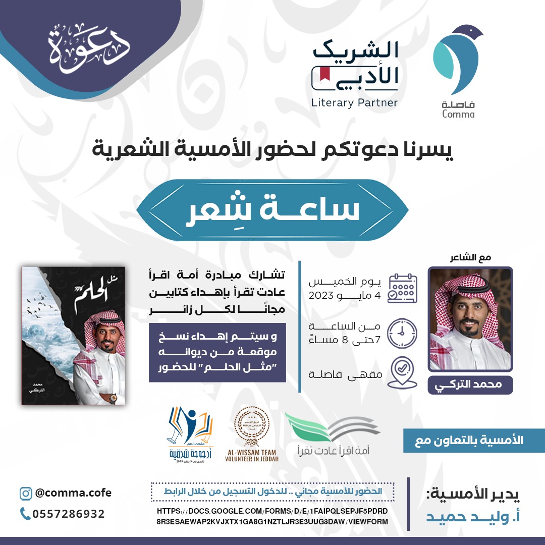 يقيم مقهى فاصلة الشريك الأدبي أمسية شعرية بعنوان (ساعة شعر) بالتعاون مع مقهى أرجوحة شرقية الأدبي، وفريق الوسام التطوعي بجدة، وذلك يوم الخميس 4 مايو 2023 من الساعة 7 إلى 8 مساءً في مقهى فاصلة.