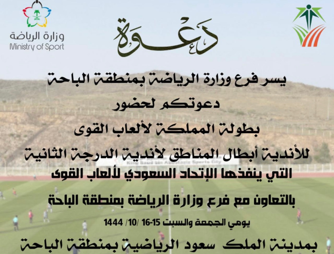 ينظم فرع وزارة الرياضة بمنطقة الباحة بالتعاون مع الاتحاد السعودي لألعاب القوى، بطولة المملكة لألعاب القوى للأندية أبطال للدرجة الثانية والتي ينفذه الاتحاد السعودي لألعاب القوى اليوم الجمعة وغدا السبت ١٥-١٩/ ١٠/ ١٤٤٤هـ بمدينة الملك سعود الرياضية بمنطقة الباحة.