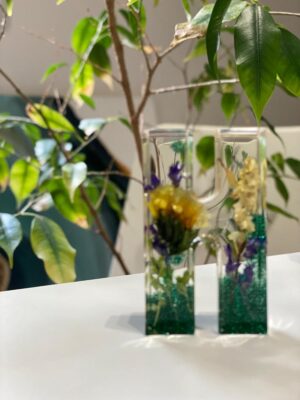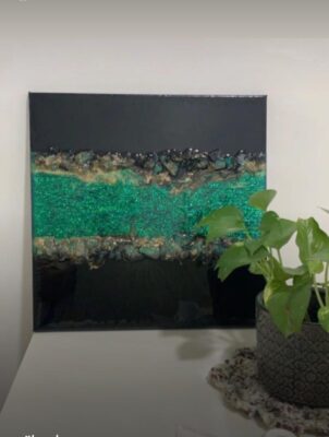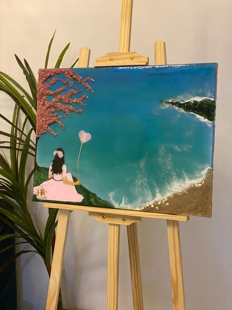 فكرتها مختلفة عملتها بمواد مختلفة والمادة الأساسية فيها ماده الريزن حيث يحتاج له تكنيك معين وورشة خاصة بعيدة عن محيط البيت لأنها مواد تتفاعل ولابد من تهوية للمكان ا، ولابد من لبس الكمامات والقفاز حتى نمنع أي حساسيه تحصل على الجلد لا سمح الله.