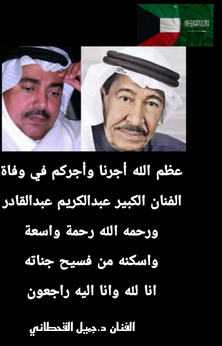 قدم الممثل والمخرج د. جميل القحطاني المعروف بفارس المدينة تعازيه لأسرة الفقيد الفنان الكبير عبدالكريم عبدالقادر ولمحبيه في كافة الوطن العربي.