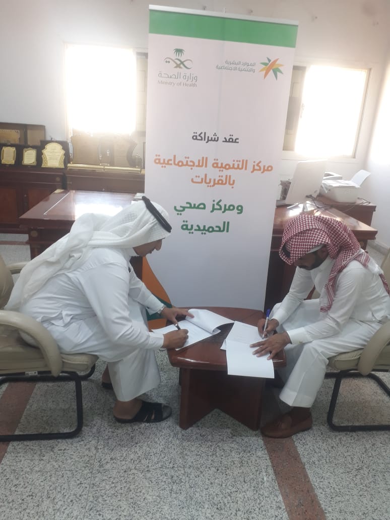 وقع مركز التنمية الاجتماعية بمحافظة القريات ممثلا بمدير المركز الأستاذ / سالم بن محمد الشراري عقد شراكة مع مركز صحي الحميدية ممثلا بالأستاذ/ احمد لافي العازمي.