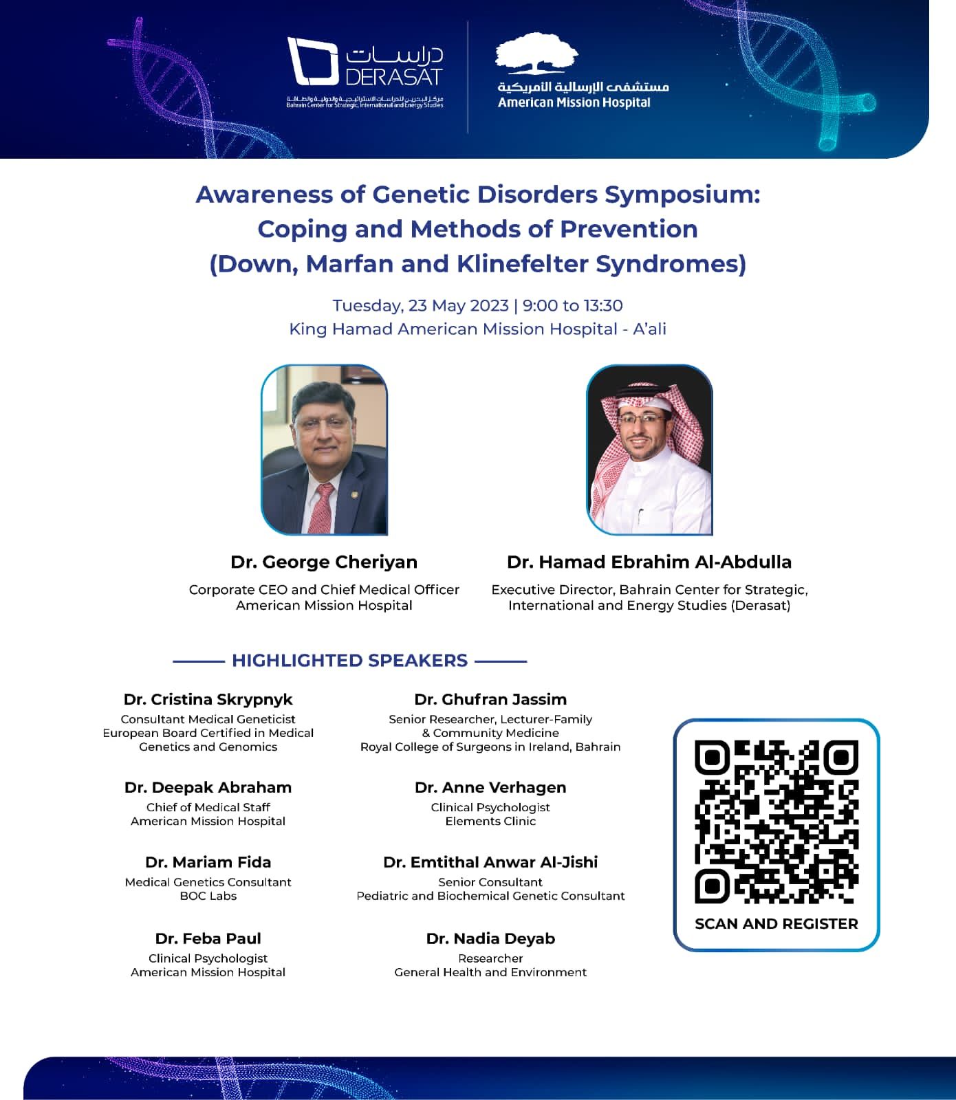بمشاركة نخبةٍ من الأطباء والمتخصصين ينظم مركز “دراسات” ومستشفى الإرسالية الأمريكية ندوةً حول الوعي بالاضطرابات الجينية يُنظم مركز البحرين للدراسات الاستراتيجية والدولية والطاقة “دراسات” ندوةً باللغة الإنجليزية بعنوان “الوعي بالاضطرابات الجينية: التأقلم وطرق الوقاية”، بالتعاون مع مستشفى الإرسالية الأمريكية في مملكة البحرين، صباح يوم الثلاثاء 23 مايو 2023م بمستشفى الملك حمد – الإرسالية الأمريكية في عالي.