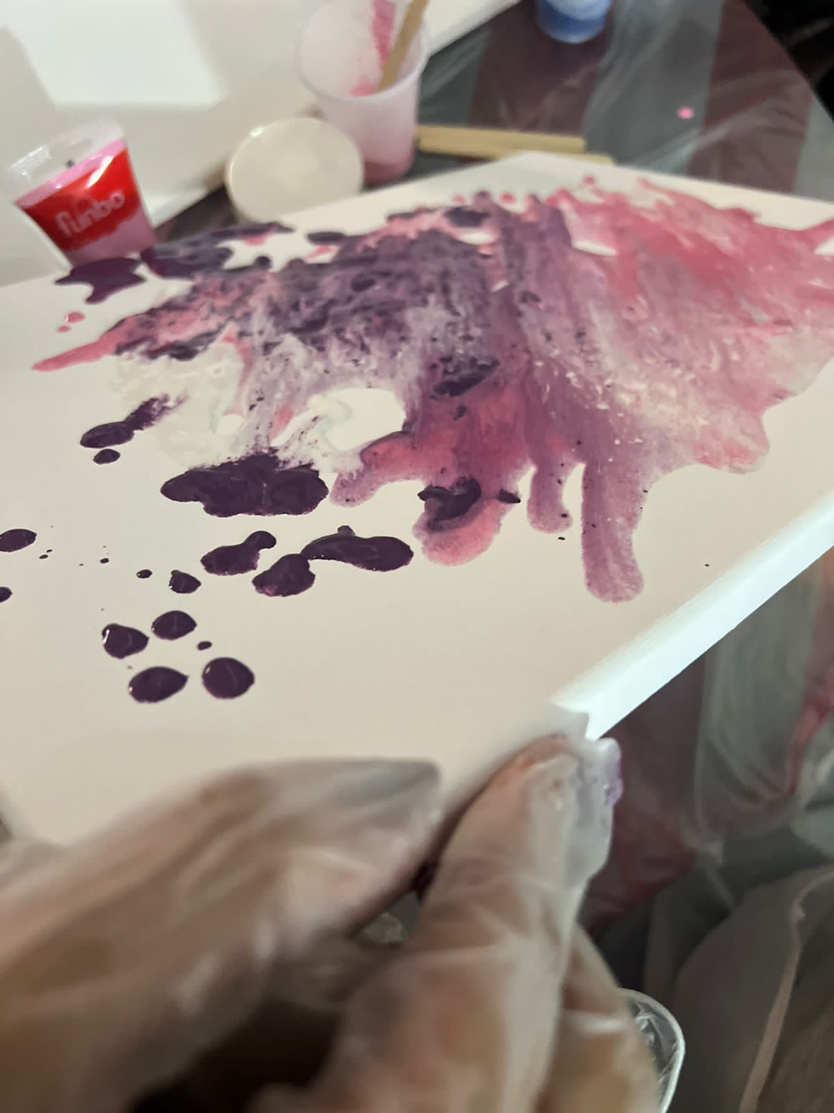 تضمنت الورشة المحاور التالية: أدوات فن السكب ، شرح الألوان ، طريقة استخراج درجات الألوان ، شرح آلية السكب وتوزيع اللون ، عمل لوحة فنية بألوان الأكرليك.