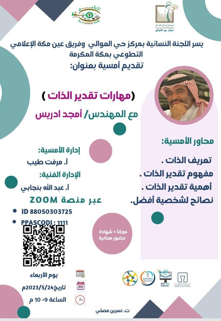 تقدم اللجنة النسائية لمركز لمركز حي العوالي وفريق عين مكة الاعلامي التابعين لجمعية مراكز الاحياء بمكة المكرمة امسية مهارات تقدير الذات المحاور :