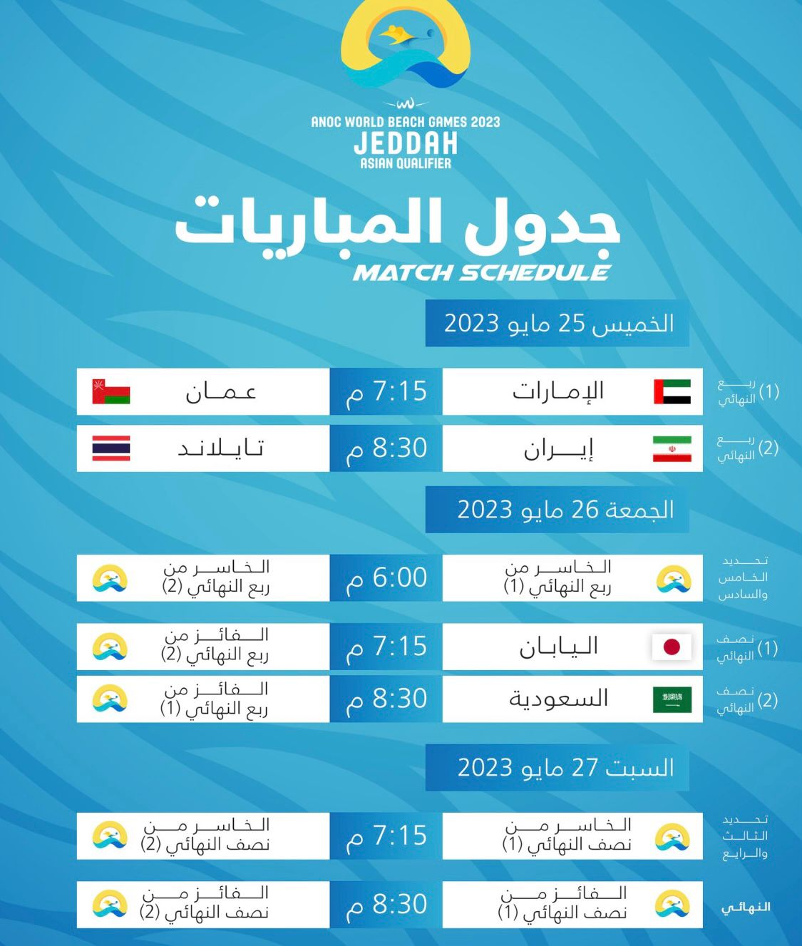 تنطلق غدًا الخميس، بطولة أنوك الشاطئية والتي يستضيفها الاتحاد السعودي لكرة القدم وتحتضنها مدينة جدة خلال الفترة من 25-27 مايو الجاري بمشاركة 6 منتخبات هي عمان، الإمارات، إيران، تايلاند، اليابان بالإضافة إلى المنتخب الوطني.