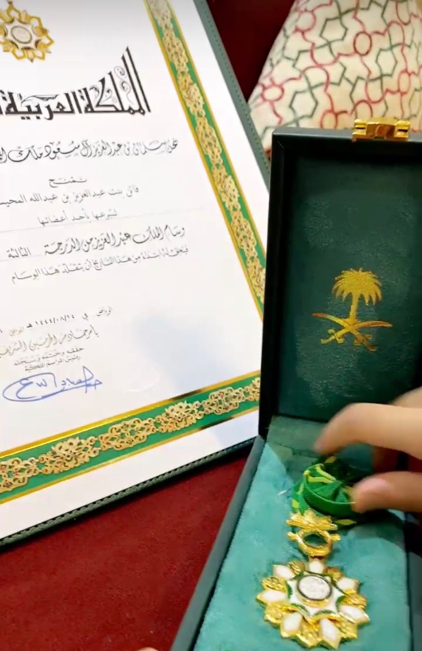 ‏تهانينا القلبية وألف مبروك لبنت طريف ‏الأستاذة/ فاتن عبدالعزيز المحيسن على هذا الإنجاز الثمين والعظيم بمنحها وسام الملك عبدالعزيز‬⁩ من الدرجة الثالثة ؛نظير تبرعها بأحد أعضائها لأختها ، ألبسهما الله لباس الصحة والعافية وبأمثالك نفتخر فالإنسانية هي مبدأ التعاون.