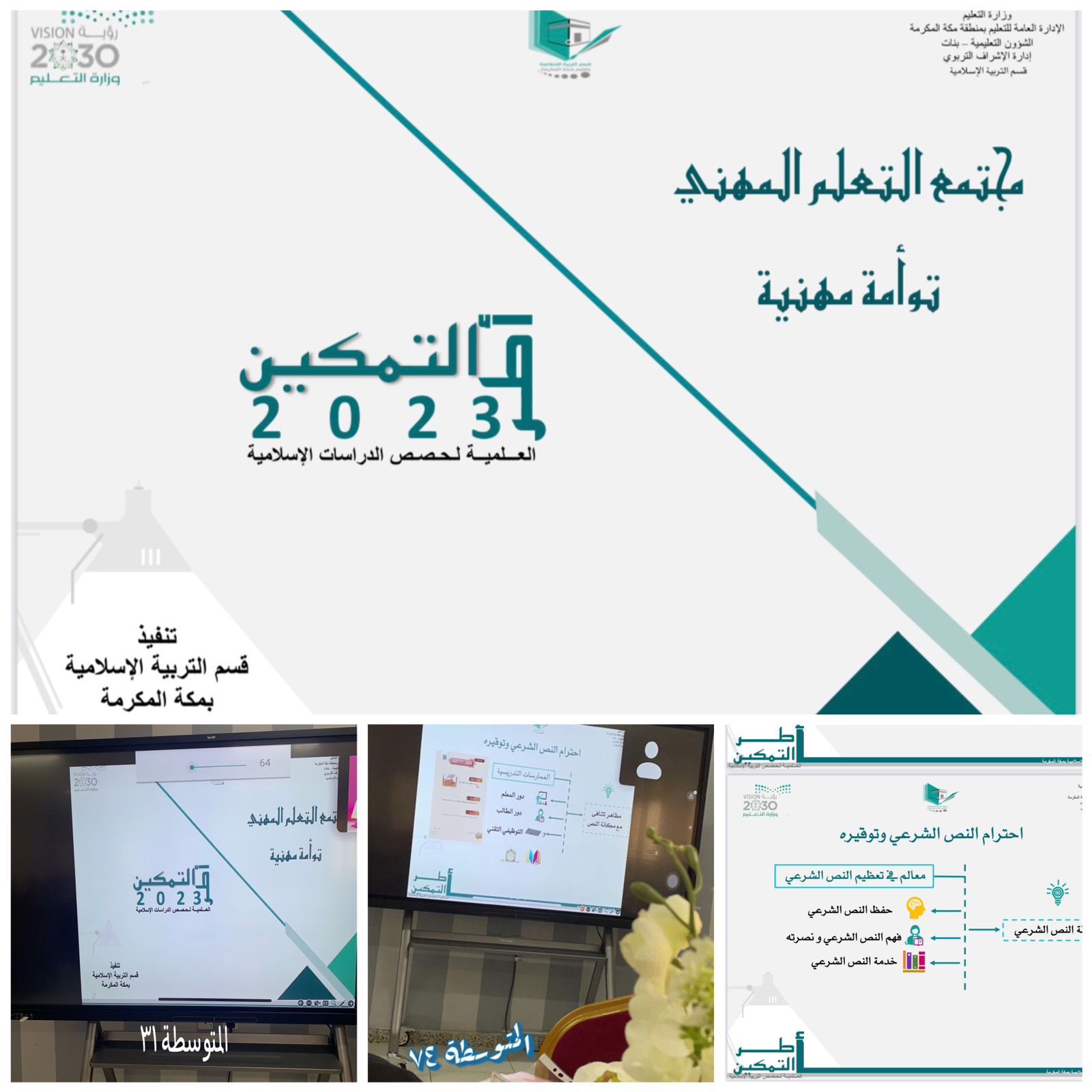 نفذت الإدارة العامة للتعليم بمنطقة مكة المكرمة ممثلة في إدارة الإشراف التربوي – قسم التربية الإسلامية – مجتمع التعلم المهني عبر الشاشة التفاعلية وبرنامج الزوم تحت عنوان ” أطر التمكين 2023 العلمية لحصص الدراسات الإسلامية ” اليوم الخميس الموافق 1444/11/5هـ والمقام بمتوسطة سودة بنت زمعة ، نفذته كل من المشرفات : جواهر العنقاوي ، حنان المزروعي ، خضرة الشنقيطي ، عائشة العبدلي ، علياء عسيري ، منى الطريف وذلك بمشاركة المعلمات نادية المغامسي ووفاء هزازي ، حيث استهدف اللقاء المشرفات التربويات والمعلمات وذلك بهدف تجويد الممارسات التدريسية باستخدام الشاشات التفاعلية واحترام النص الشرعي وتوقيره ، واستعراض مشاهد تربوية في مقررات التربية الإسلامية ، وصناعة الوعي السوي ، الوعي السياسي ، والوعي الاقتصادي ، والوعي الاجتماعي .
