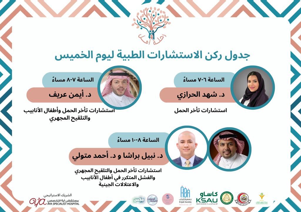 وتتضمن الاستضافة كل من : الدكتورة شهد الحرازي من الساعة ٦-٧ للرد على الاستشارات المتعلقة بتأخر الحمل ، والدكتور أيمن عريف من الساعة ٧-٨ للرد على الأسئلة المتعلقة بتأخر الحمل وأطفال الأنابيب والتلقيح المجهري ، والطبيبان د.نبيل براشا ود. أحمد متولي من الساعة ٨-١٠ للرد على التساؤلات المرتبطة بتأخر الحمل وأطفال الأنابيب والتلقيح المجهري والفشل المتكرر في أطفال الأنابيب والاعتلالات الجينية.