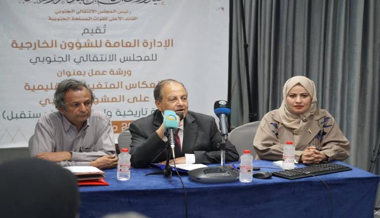 نظمت الادارة العامة للشؤون الخارجية بالمجلس الانتقالي الجنوبي، اليوم الاحد، في العاصمة عدن، ورشة عمل بعنوان “انعكاس المتغيرات الإقليمية على المشهد الجنوبي.. خلفية تاريخية واستشراف المستقبل”.