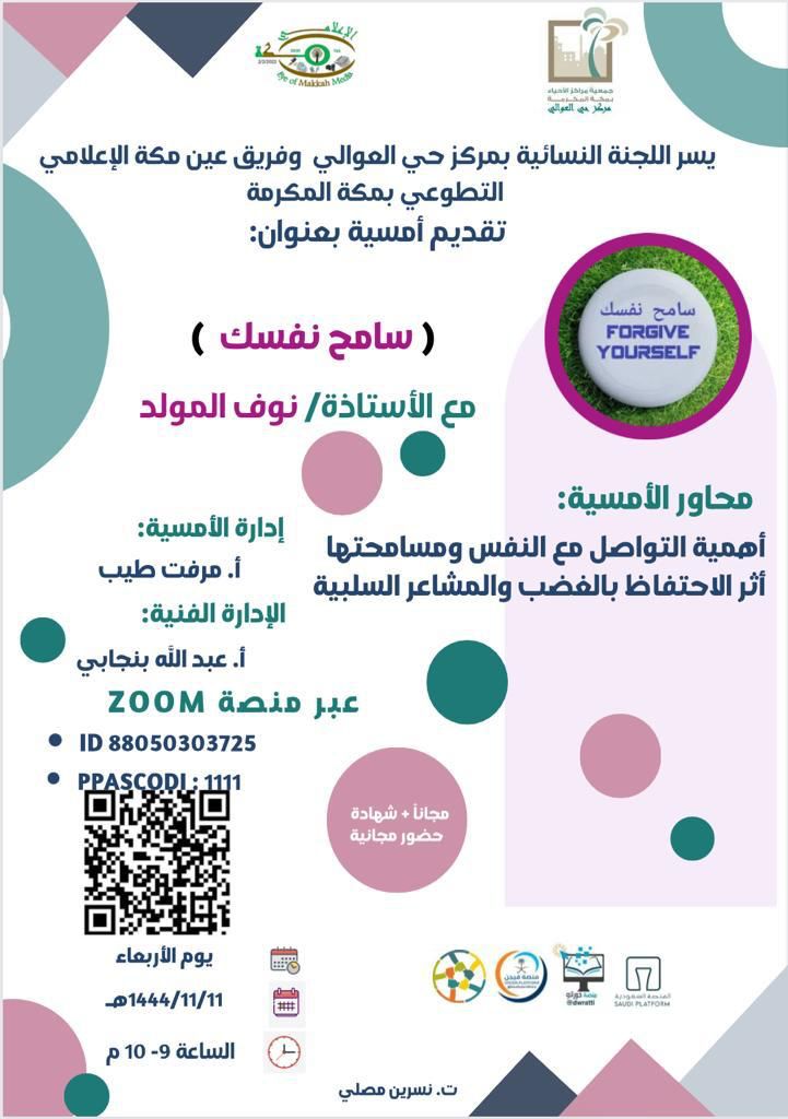 تقدم اللجنة النسائية لمركز حي العوالي وفريق عين مكة الإعلامي التابعين لجمعية مراكز الأحياء بمكة المكرمة أمسية عن بعد بعنوان (سامح نفسك) ،مع الأستاذة : نوف المولد ، وذلك يوم الأربعاء 11/11/1444هـ الساعة 9 – 10م عبر الرابط التالي: