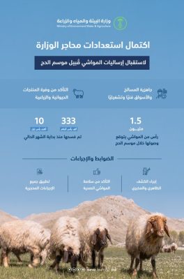 بدأت وزارة البيئة والمياه والزراعة في تنفيذ خطتها بتغطية طلب السوق المحلي للمواشي وجاهزية محاجرها لاستقبال إرساليات المواشي قبيل موسم الحج، وتتوقع الوزارة أن تصل أعداد المواشي إلى 1.5 مليون رأس من الماشية. وأوضحت البيئة أن الضوابط والإجراءات ستكون بإجراء الكشف الظاهري والمخبري مع التأكد من سلامة المواشي الصحية وتطبيق جميع الإجراءات المحجرية.